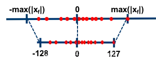 所谓的对称量化,即使用一个映射公式将输入数据映射到[-128,127]的范围内,如下图所示。