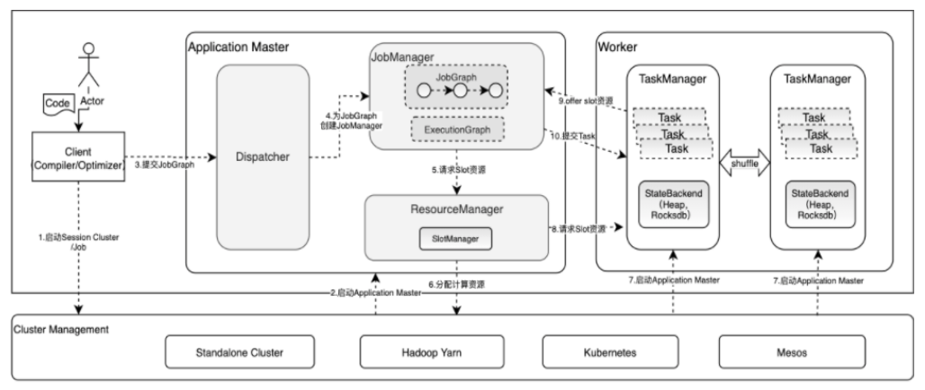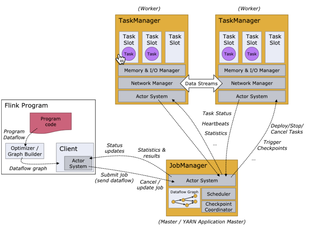 管理节点,每个集群至少一个(可以选择设置多个以保证集群高可用),管理整个集群计算资源,Job管理于调度执行,以及Checkpoint协调。