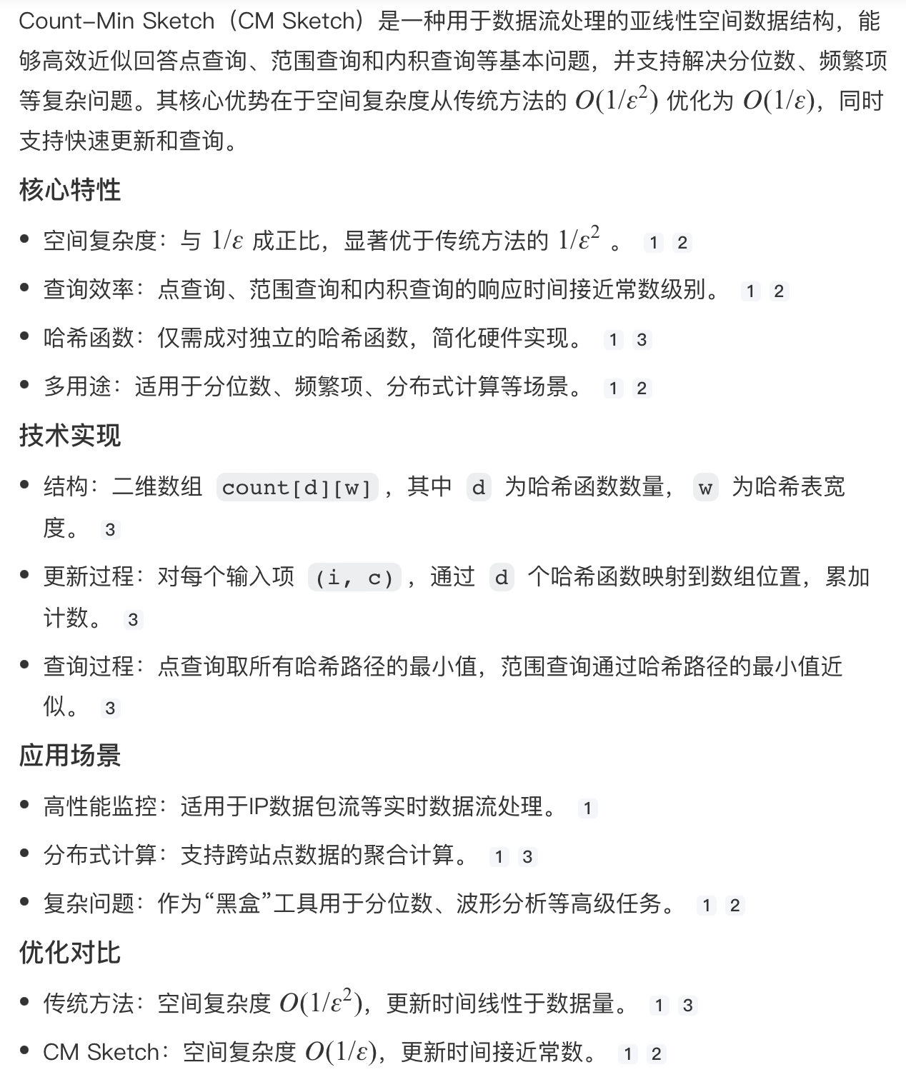 Count-Min Sketch通过使用多个哈希函数将元素映射到一个二维计数矩阵中,并在每个哈希位置累加计数来跟踪元素的出现频率。每次更新时,对于每个哈希函数,找到对应的计数器并增加其值。查询时,对于每个元素,使用所有哈希函数计算哈希值,并取这些哈希位置计数的最小值作为该元素频率的估计。这样,即使存在哈希碰撞,估计值也不会低于真实值。通过调整矩阵的宽度和深度(即哈希函数的数量和计数器的行数),可以控制误差范围和空间消耗,占用存储非常少,并且与数据量大小无关;假如每个计数单元占4B存储,几十万的数据,也就需要几十KB左右的存储就够了。非精确概率计算也适用于热点key的频率估计。