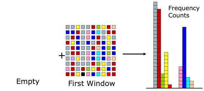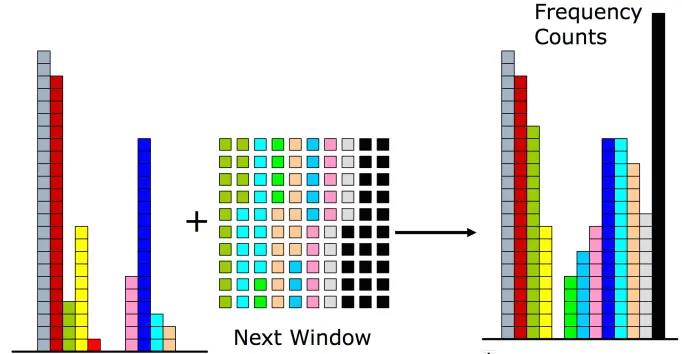 - 重复上述步骤,每次都统计一个窗口中的元素,将频率值累加到计数器中,并将所有计数器自减1,并将计数器减为0的元素从集合中移除。