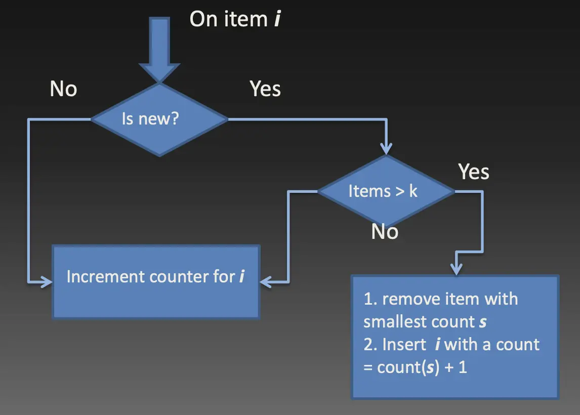 本质上是Misra-Gries和Lossy Counting算法的折衷,也是目前应用最广泛的Heavy Hitters算法之一。它维护k = 1/ε个候选值与计数器的集合,操作流程如下图所示。