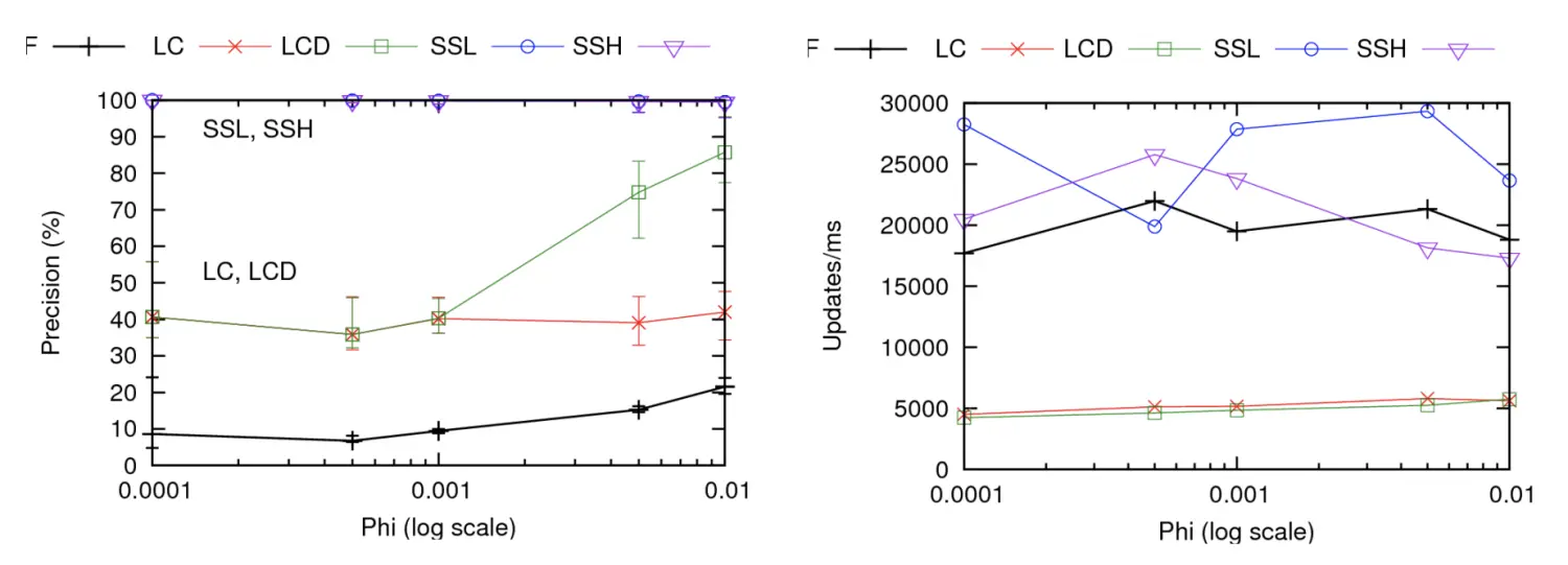 Space Saving算法在贴近实际应用的Zipfian数据集上的benchmark如下图所示,可见与其他算法相比,无论在准确率方面还是效率方面都几乎是最优的。