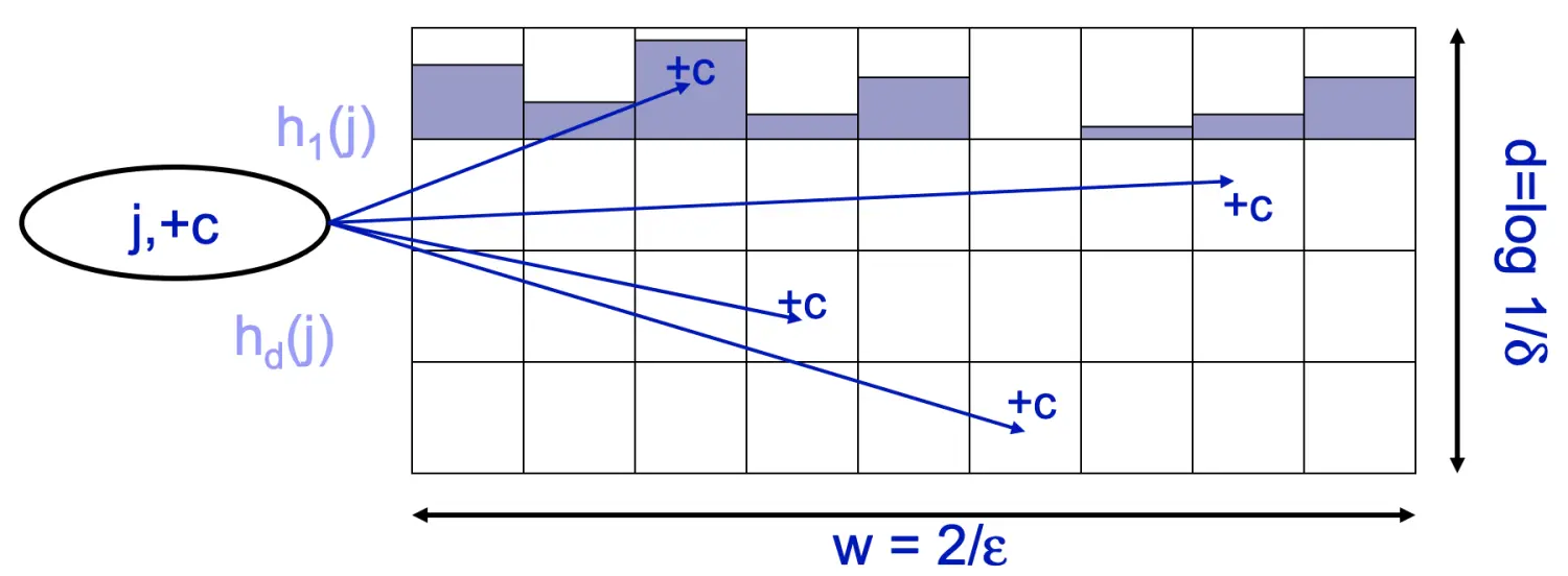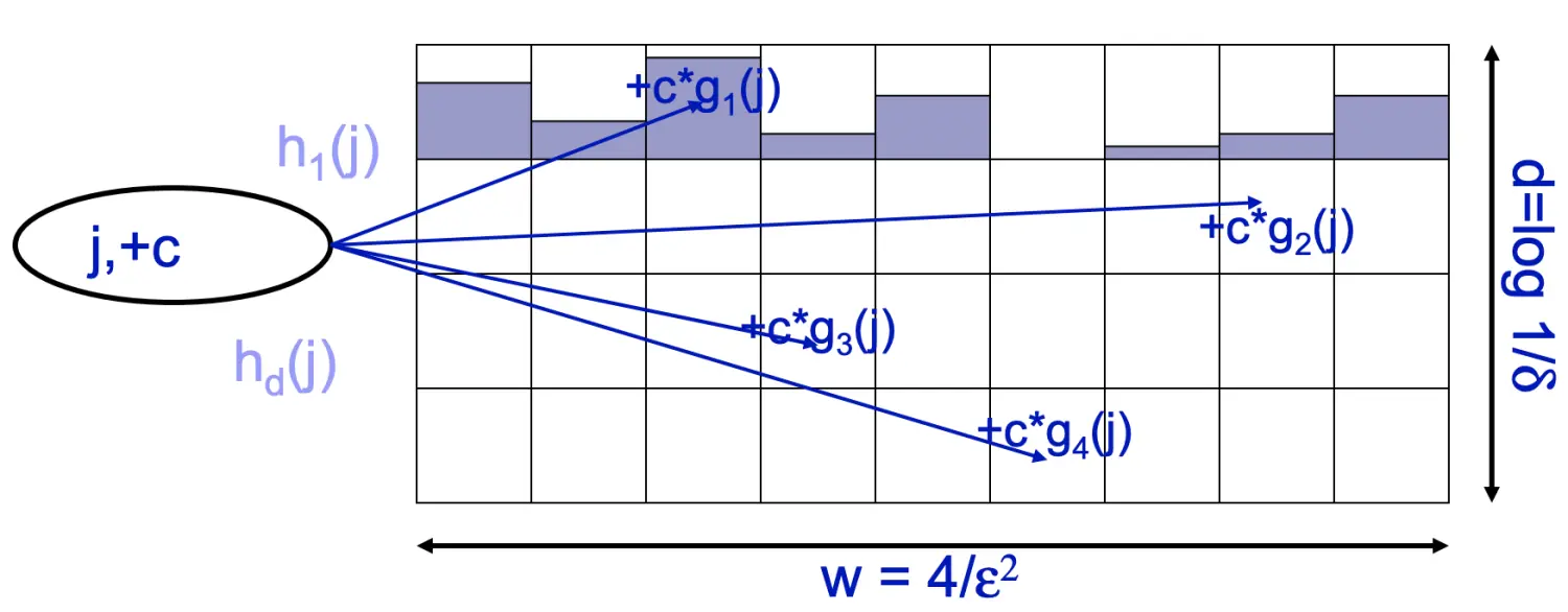 当数据流中元素j出现c次时,将j分别用哈希函数h1…hd映射到二维数组中每一行的对应位置,并将该位置的值加上c*g(j),如下图所示。